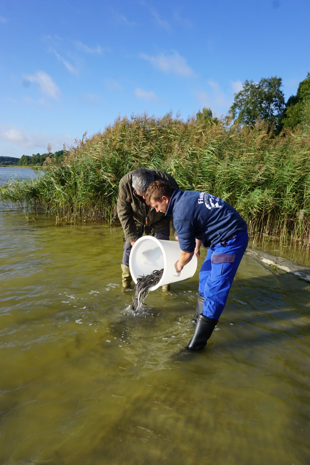 Foto: Aale, finanziert über die Aalaktie von 5000 Euro der WEMAG, werden hier in den Goldberger See eingesetzt. Foto: Claudia Thürmer